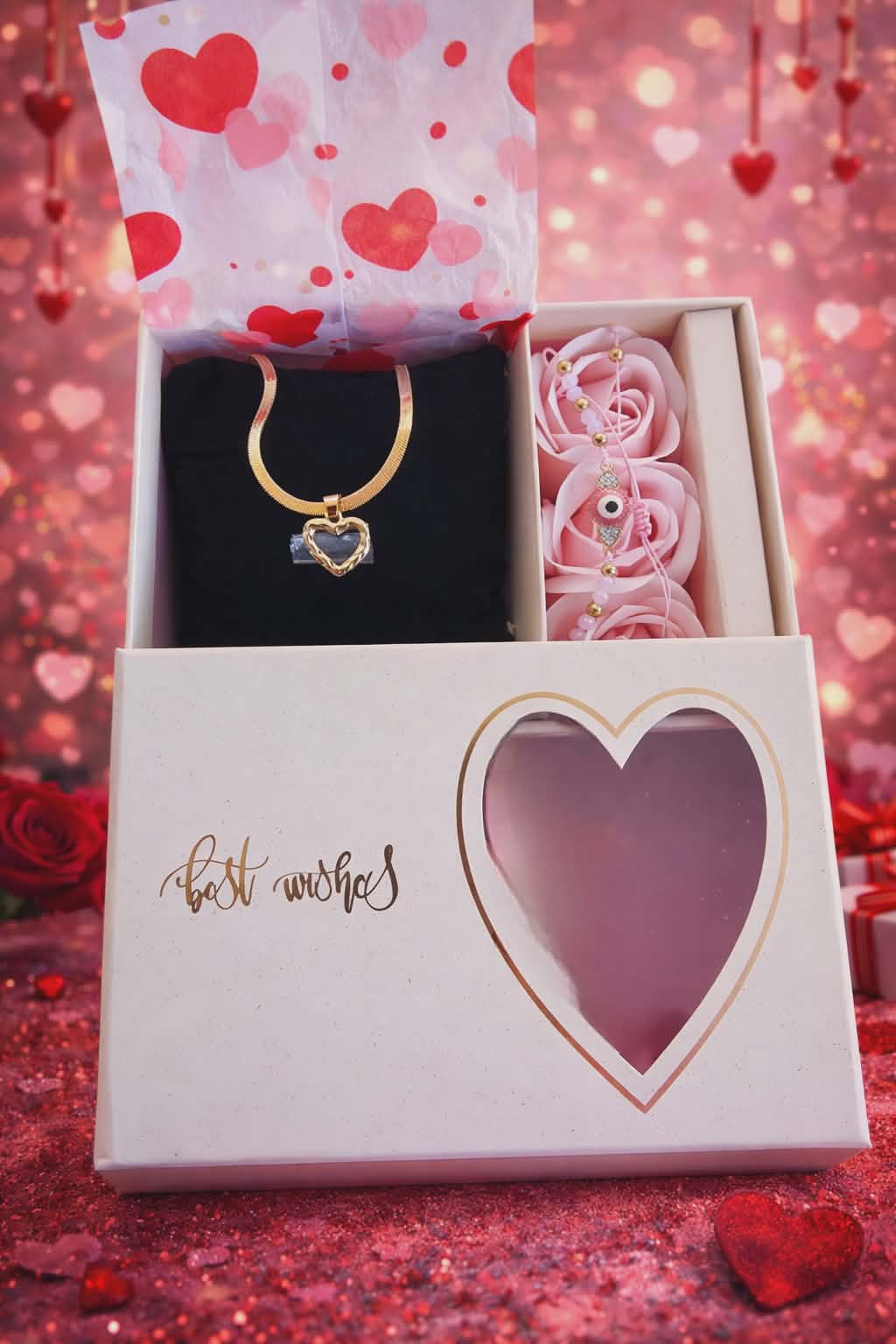 A caixa inclui um lindo colar dourado com pingente em formato de coração, acompanhado de delicadas rosas decorativas, criando uma apresentação sofisticada e cheia de charme.