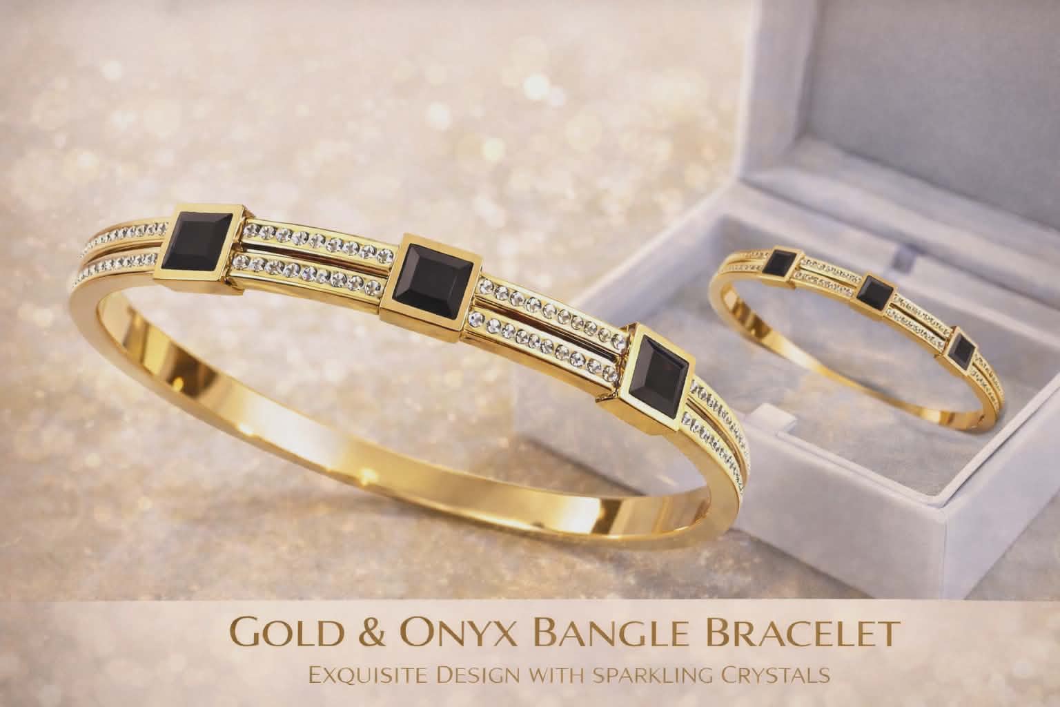 Pulseira Dourada com Ônix e Cristais – Modelo Bangle